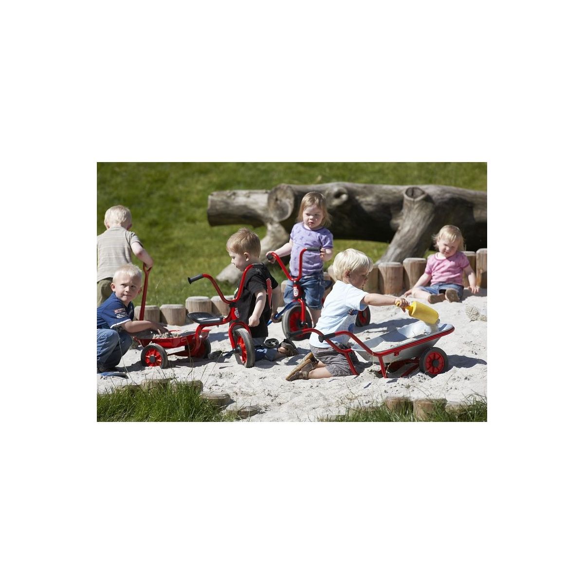Specifications:Easy to assemble. Harmonious, safe design with no sharp edges. Weather-resistant rubber seat. Solid rubber handle grip. Front and rear wheels are fitted with long-lasting industrial ball bearings, which also makes pedalling easy. Strong, non-slip pedals. Solid one-piece steel crank. Spokeless wheels with solid rubber tyres. Rubber stops to ensure children do not get fingers caught.