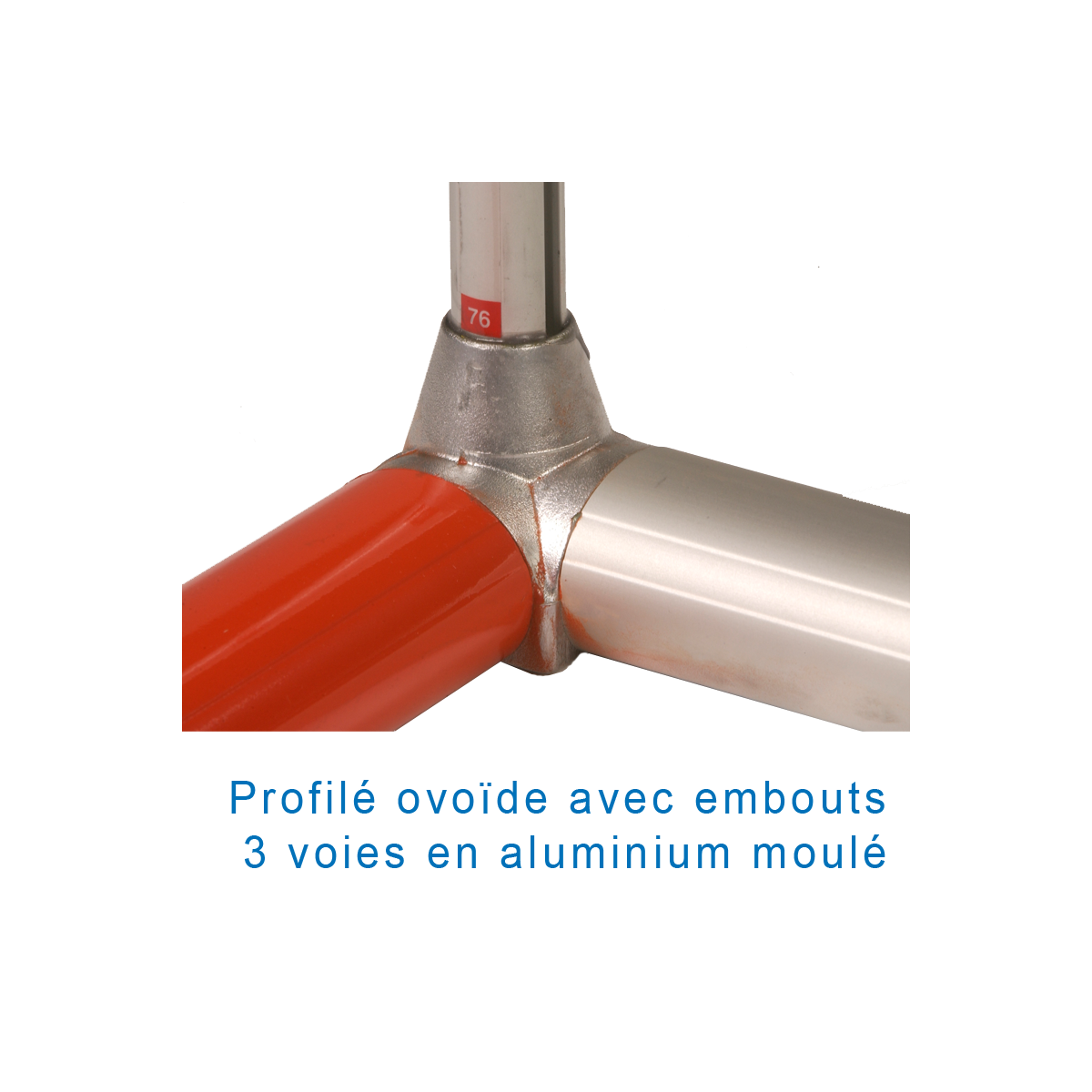 In painted anodised oval extruded aluminium, with no protruding angle. Three-way end piece in moulded aluminium