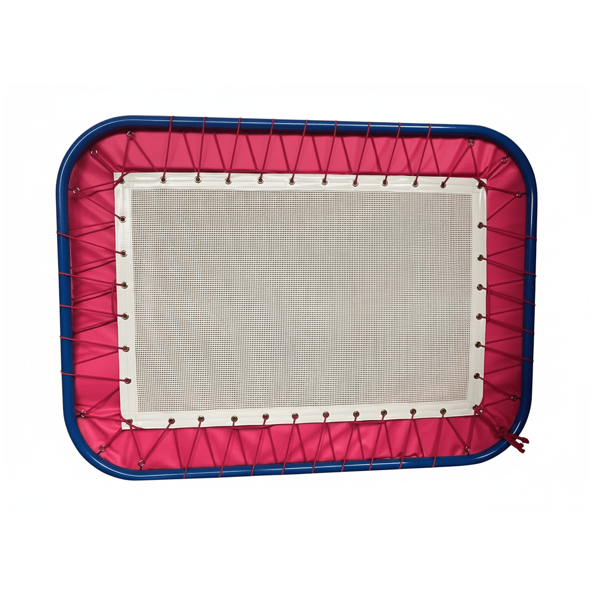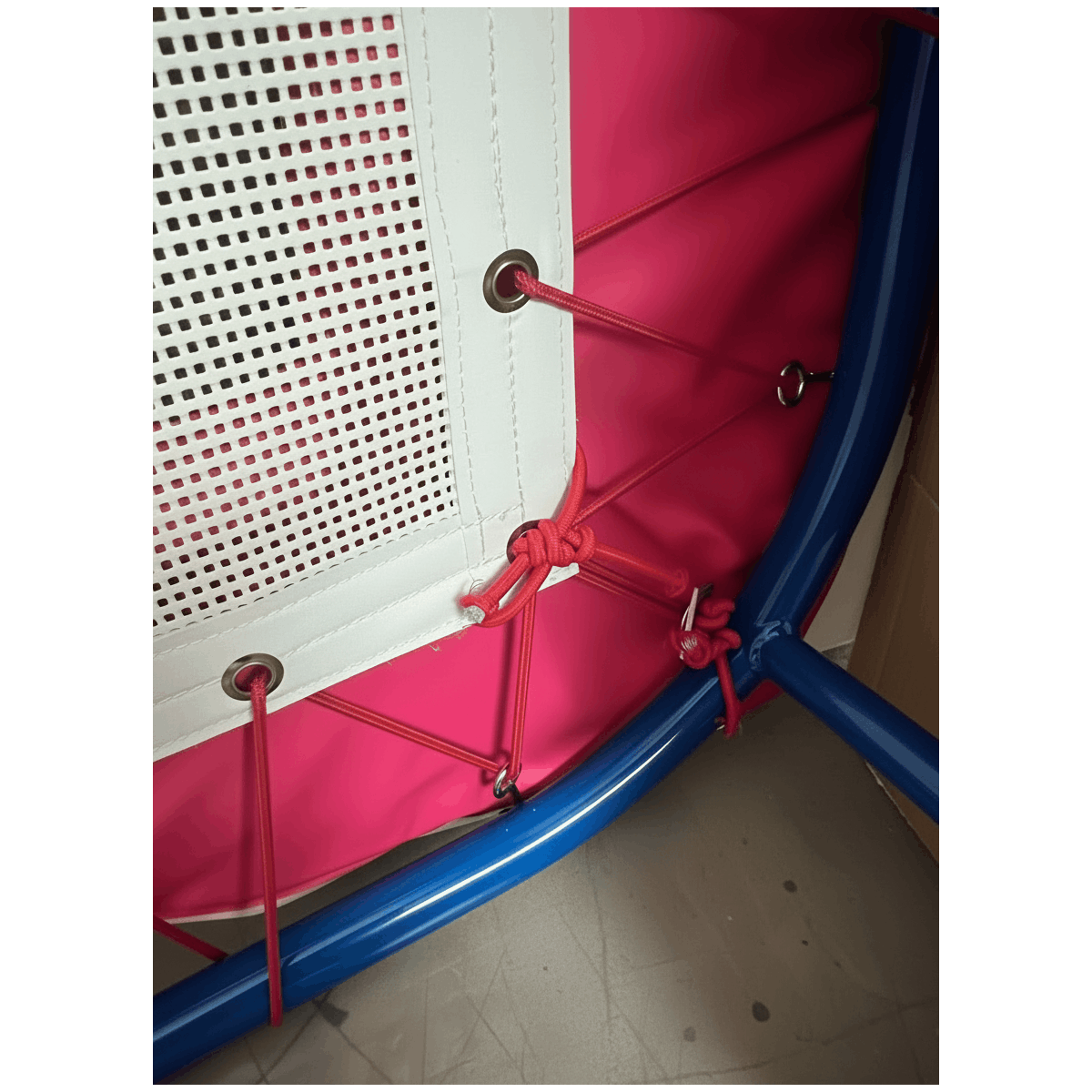 Nylon bed linked to the frame by a bungee cord.