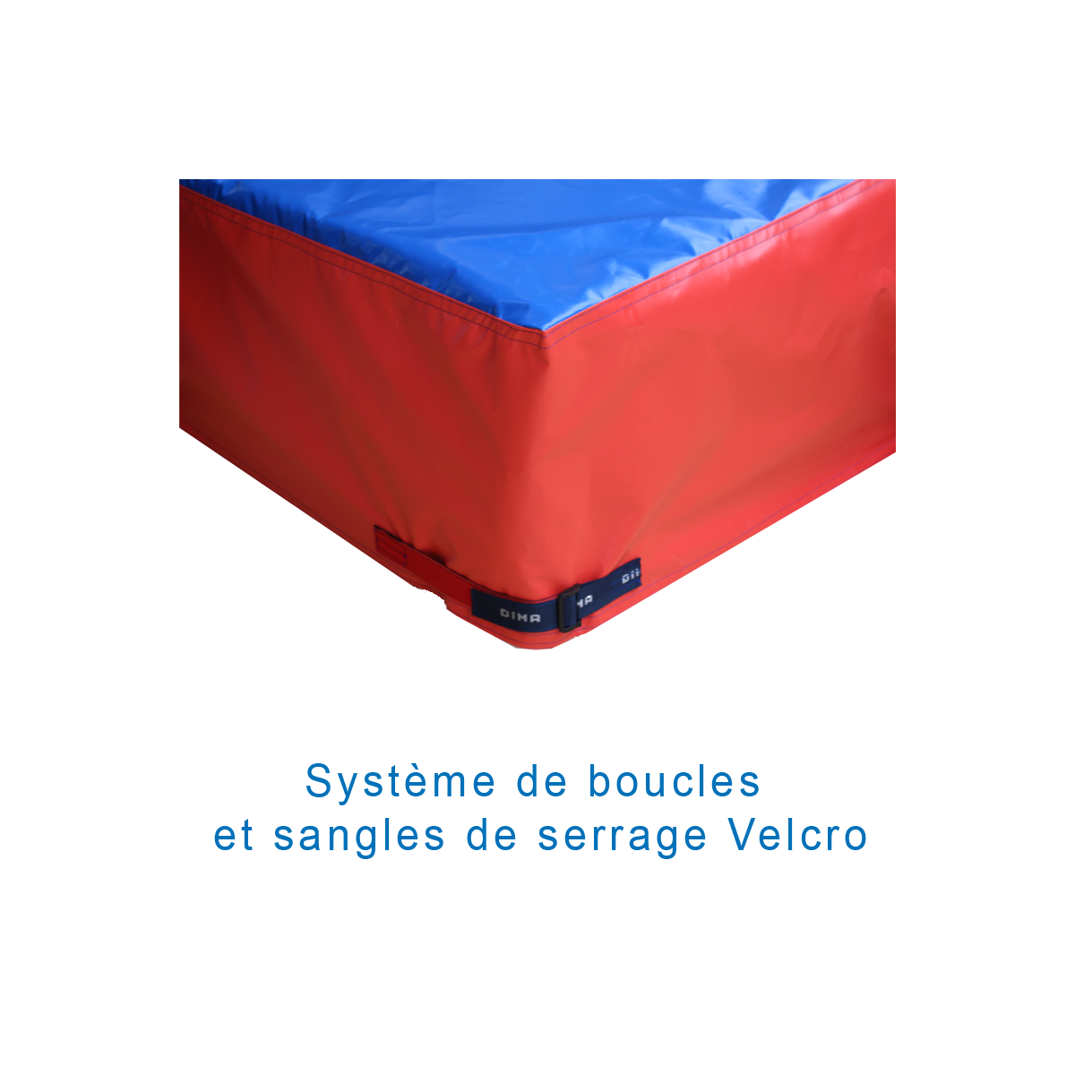 Système de boucles et sangles directement cousues aux angles de la bâche intempéries pour resserrer celle-ci sur le sautoir empêchant les prises au vent.