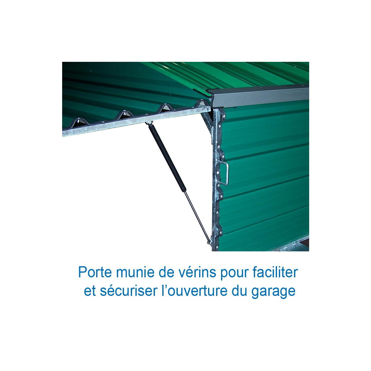 Portes montées sur vérins à ouverture type « hayon » sécurisée pour une prise au sol diminuée, une manipulation et un dégagement du garage aisés.