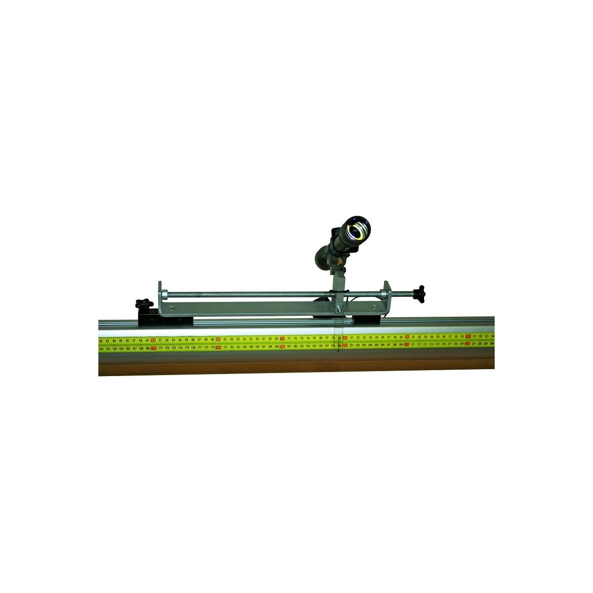 Une règle graduée munie d'une glissière avec un téléscope permet la visée de l'empreinte et la lecture directe de la performance. Monté sur deux trépieds.
