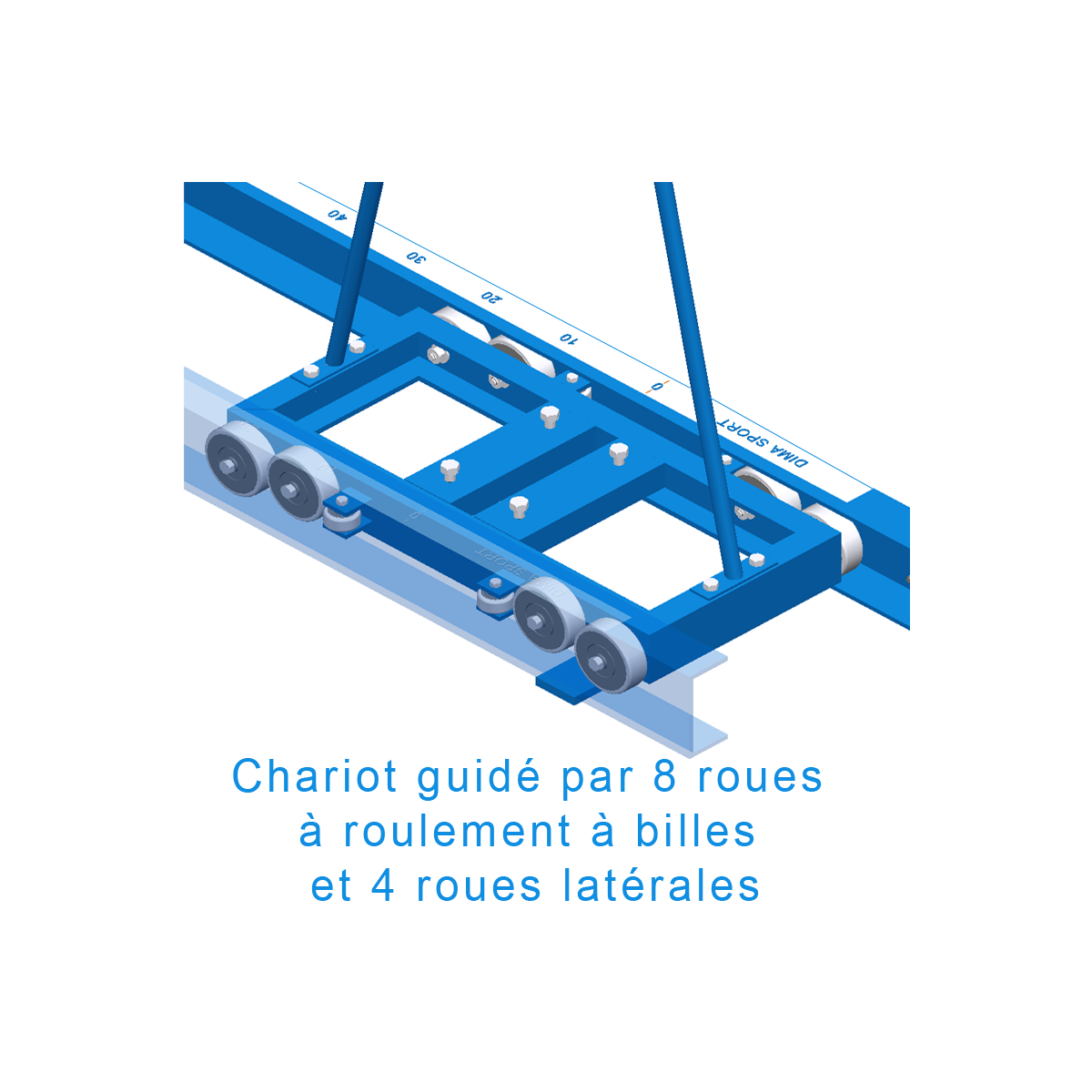 Chariot intérieur coulissant guidé par 8 roues à billes et 4 roues latérales pour un meilleur alignement.