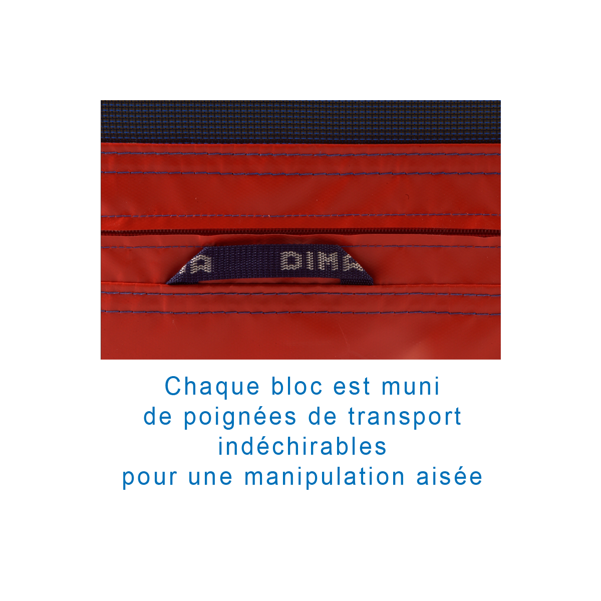 Composé de blocs aéromousse construits par assemblage de plaques et bandes de mousse polyuréthane grande qualité, de portances différentes. Ce concept exclusif DIMA permet des réceptions sécurisées et progressives quels que soient le poids de l'athlète et la hauteur de chute.
